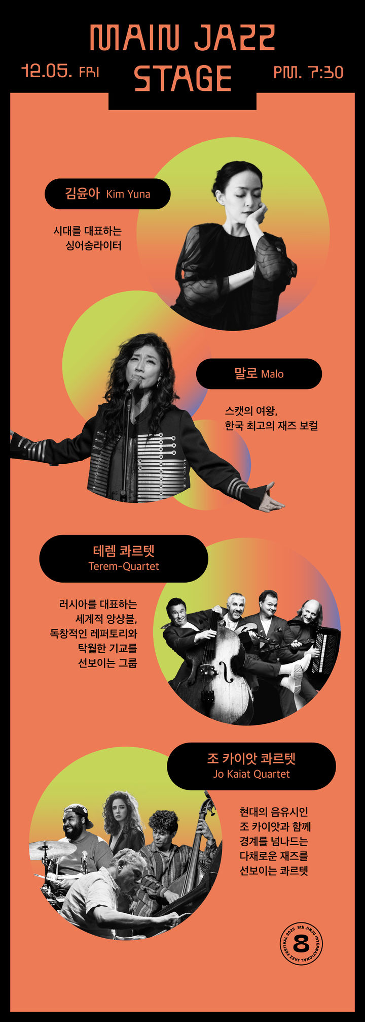 또한 해외 아티스트는 러시아를 대표하는 세계적 앙상블 테렘 콰르텟, 현대의 음유시인 조 카이앗과 함께 경계를 넘나드는 다채로운 재즈를 선보이는 조 카이앗 콰르텟, 더블베이스와 보컬의 놀라운 케미, 라틴아메리카와 카탈루냐의 노래들을 재해석하는 마갈리 사레&마넬 포르티아, ‘두 번의 숨결, 하나의 소리’ 형제의 호흡이 만들어내는 재즈 듀오 에코윈드가 참여해 풍성한 무대를 만들어간다.